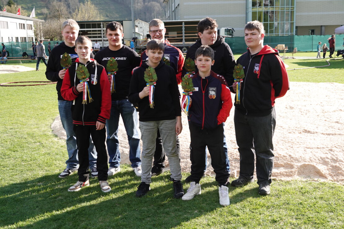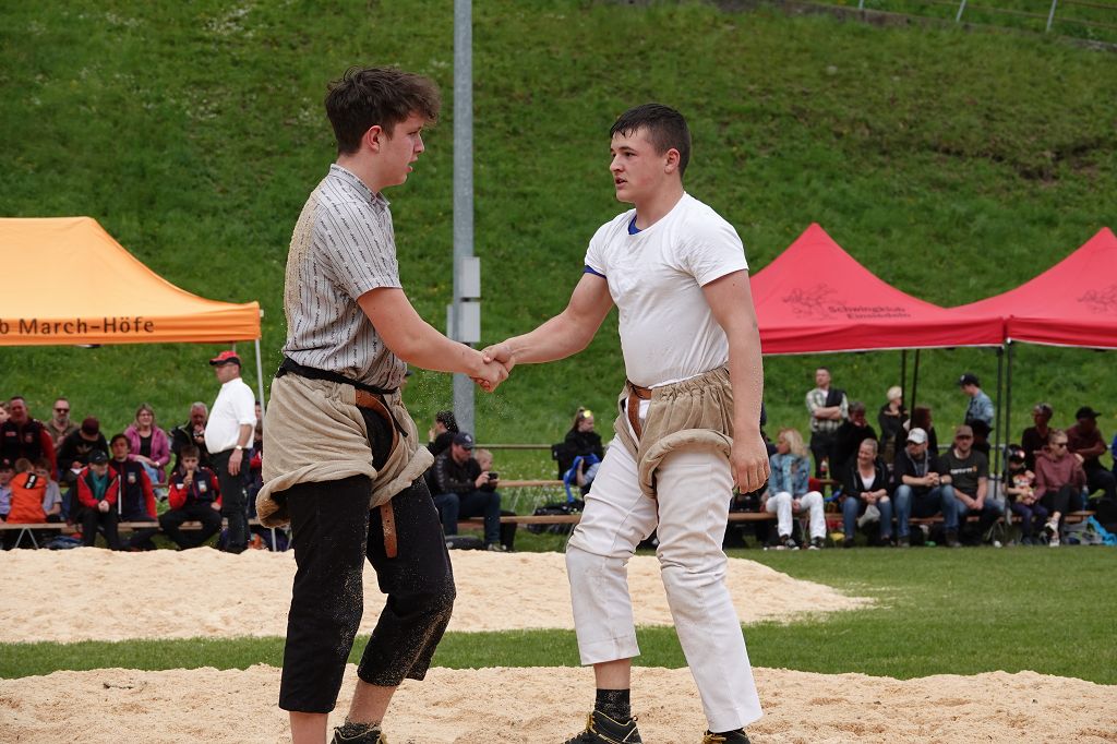 Nando Hediger und Robin Abegg hiessen die verdienten Sieger in dieser Altersstufe. Im Schlussgang trennten sich die stärksten Athleten auf dem Platz resultatlos. Gleich drei Athleten von den Ausserschwyzern konnten die begehrte Auszeichnung in dieser Kategorie abholen. Im fünften Rang Dario Koller mit vier Siegen, einer Niederlage und einem gestellten Gang. Und der zähe Altendörfler Lukas Fleischmann sicherte sich den Zweig mit 56.00 Punkten im guten siebten Rang. Den letzten Auszeichnungsrang erschwang sich Thomas Laimbacher mit drei Siegen und drei Niederlagen.